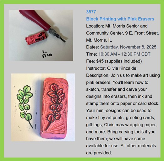 If you need to drop it off at a different time, call the Senior Center at 815-734-6335 to make arrangements.